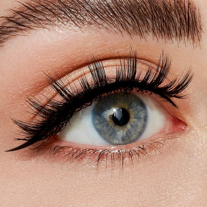 Apply your favorite Wicked Eyeliner and a light coat of Sinuosity Lash Mascara. Then, gently pick up your false lashes with the dual-ended Lash Applicator, starting at the inner corner. Hold the lashes up to your eye to measure and trim them if needed. Apply your favorite false eyelash glue to the lash band and wait 30 seconds before applying. Then, holding your false eyelashes at the center, press them onto the center of your upper lashline to align. Press in place with the applicator to secure them. Using the other side of the dual-ended Lash Applicator, comb through your eyelashes to seamlessly blend and remove any clumps. Finish your look by applying a coat of Sinuosity Lash Mascara with the E04 Lash Fan Brush.