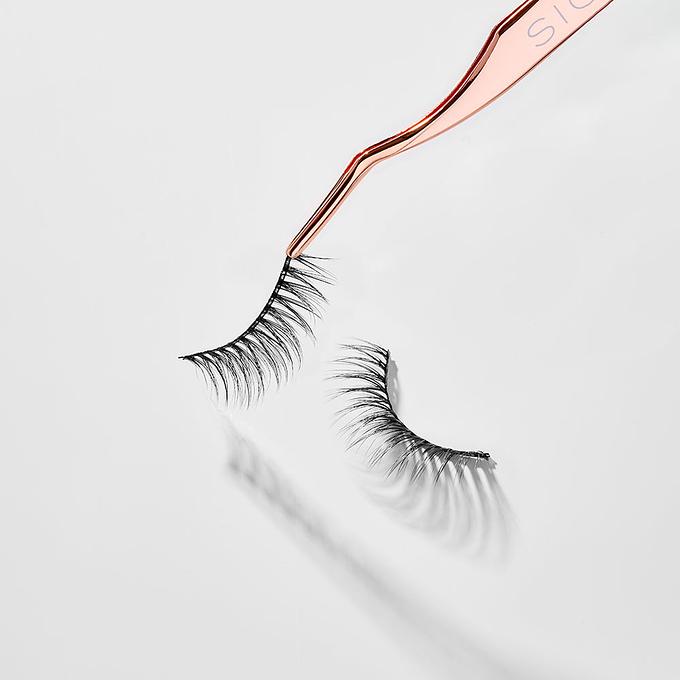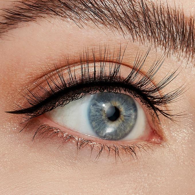 Apply your favorite Wicked Eyeliner and a light coat of Sinuosity Lash Mascara. Then, gently pick up your false lashes with the dual-ended Lash Applicator, starting at the inner corner. Hold the lashes up to your eye to measure and trim them if needed. Apply your favorite false eyelash glue to the lash band and wait 30 seconds before applying. Then, holding your false eyelashes at the center, press them onto the center of your upper lashline to align. Press in place with the applicator to secure them. Using the other side of the dual-ended Lash Applicator, comb through your eyelashes to seamlessly blend and remove any clumps. Finish your look by applying a coat of Sinuosity Lash Mascara with the E04 Lash Fan Brush.